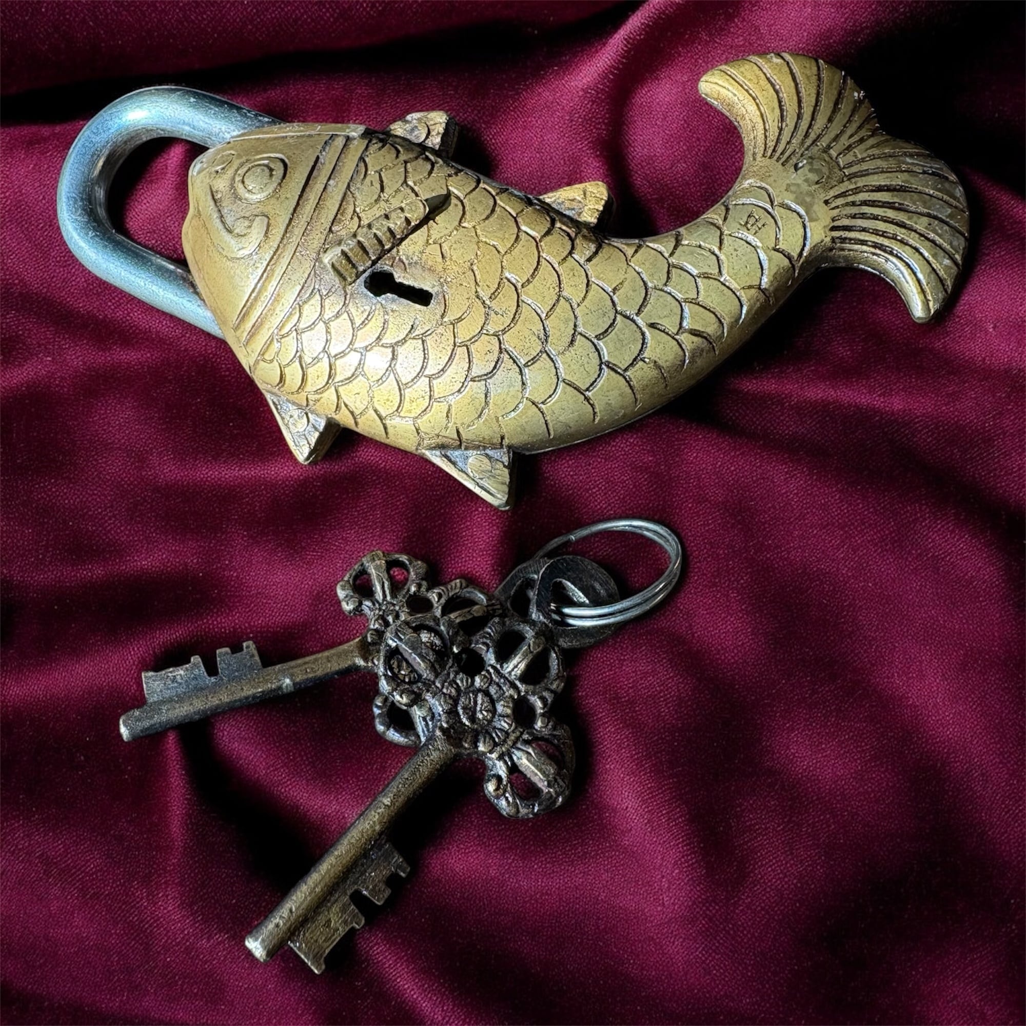 福を呼び込む真鍮の鍵 – ゴールデンフィッシュモチーフのインド製ブラスロック(鍵2本付き)