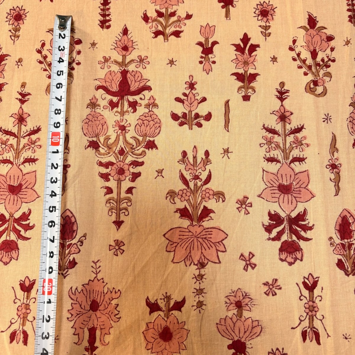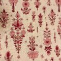 ピンクを含んだやさしいベージュ地に、赤を基調とした花文様がリズミカルに並ぶデザイン。