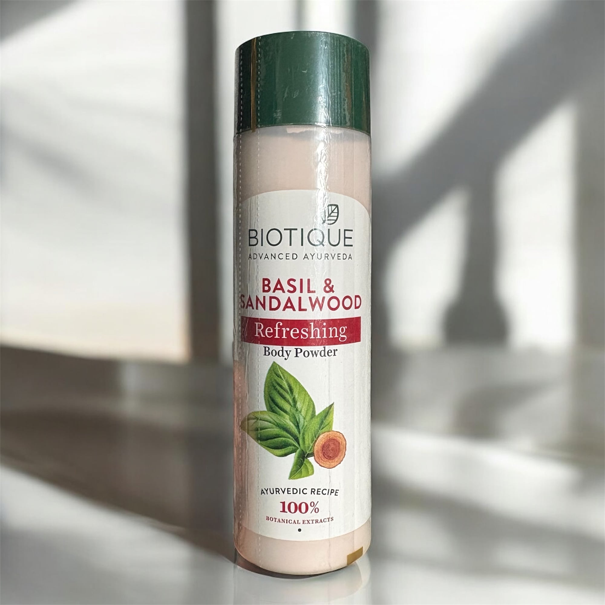 Biotique Basil And Sandalwood Body Powder のようなボディパウダー。